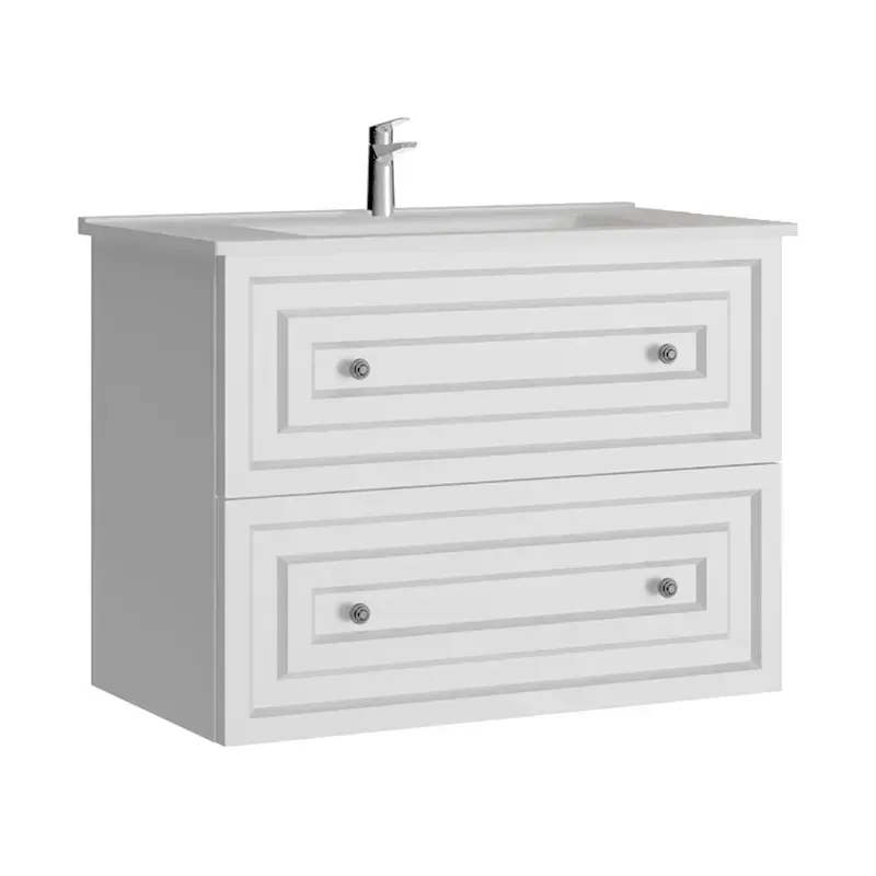 Dimenzije: Širina: 77cm Visina: 58cm Dubina: 45cm Materijal: Farbani medijapan Tip montaže: Konzolni, zidni Dve fioke Boja: Bela Površina: Mat Soft close sistem zatvaranja Sifon i poklopac sifona nisu uračunati u cenu proizvoda Luksuz na dohvat ruke s ovim prefinjenim ormarićem sa lavaboom, dizajniranim za vrhunski doživljaj u vašem kupatilu. - Dodatne informacije