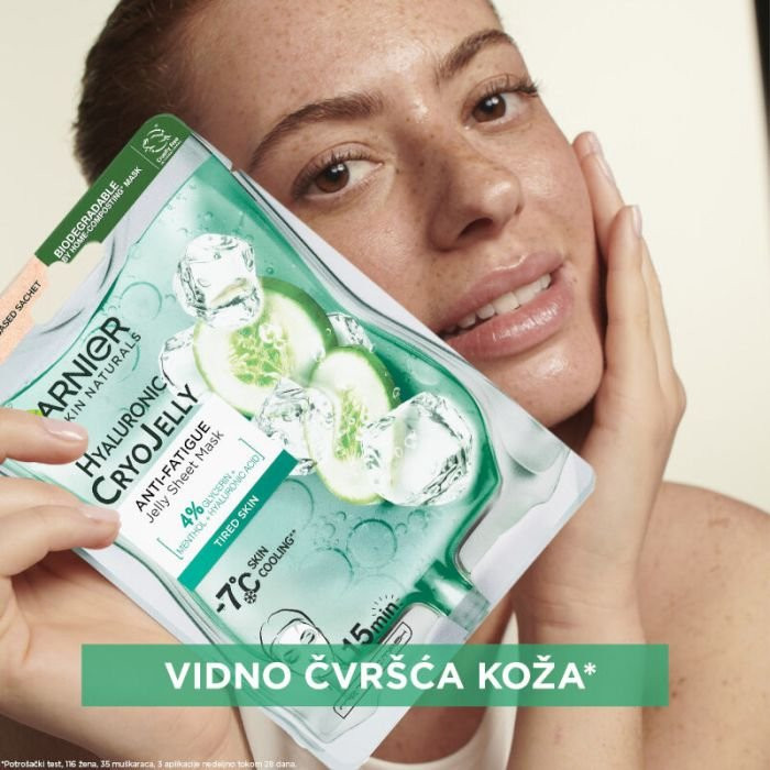 GARNIER SKIN NATURALS HYALURONIC CRYOJELLY hidrirajuća je gel-maska za lice sa efektom hlađenja koja će Vam doneti pravo osveženje! Vraća koži svežinu i pruža odmoran izgled*. Formula obogaćena hijaluronskom kiselinom, mentolom, 4% glicerina i ekstraktom krastavca čini kožu rashlađenom i osveženom tokom dana uz pomoć tehnologije hlađenja koja smanjuje temperaturu kože za 7°C**. GARNIER SKIN NATURALS HYALURONIC CRYOJELLY maska za lice idelana je za negu umorne kože lica.