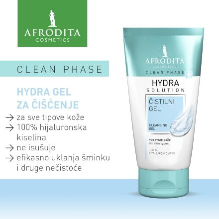 AFRODITA gel za čišćenje lica CLEAN PHASE 1, HYDRA SOLUTION preporučuje se za negu svih tipova kože. Gel sa hijaluronskom kiselinom efikasno i temeljno uklanja nečistoće i šminku sa lica. Nakon čišćenja, koža će biti intenzivno hidrirana i zaštićena od isušivanja, zahvaljujući 100% hijaluronskoj kiselini. Tako održava prirodnu ravnotežu vlage u koži i pruža joj izuzetnu negu. AFRODITA gel za čišćenje lica CLEAN PHASE 1, HYDRA SOLUTION ne sadrži parafine, silikone ili boje, a pogodan je i za vegane.