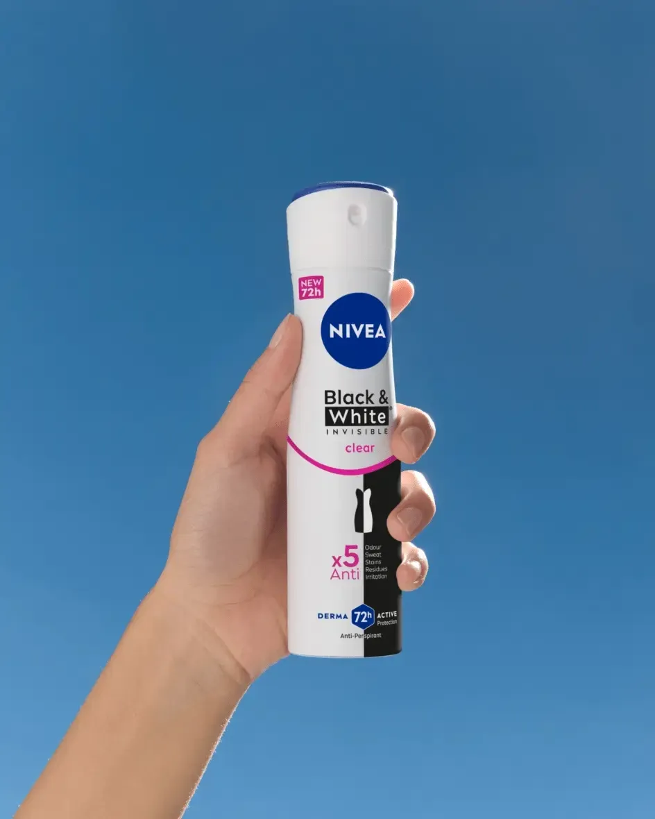 NIVEA Black & White INVISIBLE clear - antiperspirant dezodorans u spreju sa 72-časovnom anti-perspirantnom zaštitom, pruža dugotrajan osećaj sveže i čiste kože. Ne ostavlja bele tragove na tamnoj tkanini, a takođe sprečava pojavu žutih fleka na svetloj odeći. NIVEA Black & White INVISIBLE clear - antiperspirant dezodorans u spreju - zaštita 5 u 1 protiv: znojenja, neprijatnih mirisa, fleka, tragova i iritacija. - informacije