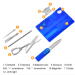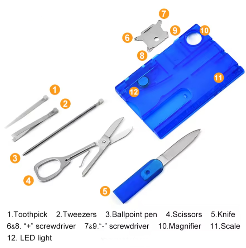 Sadrži makazice, pincetu, nožić, deo kojim se odvrću šrafovi, improvizovanu hemijsku okovku, lenjir, lupu, “čačkalicu” i malu led svetiljku.