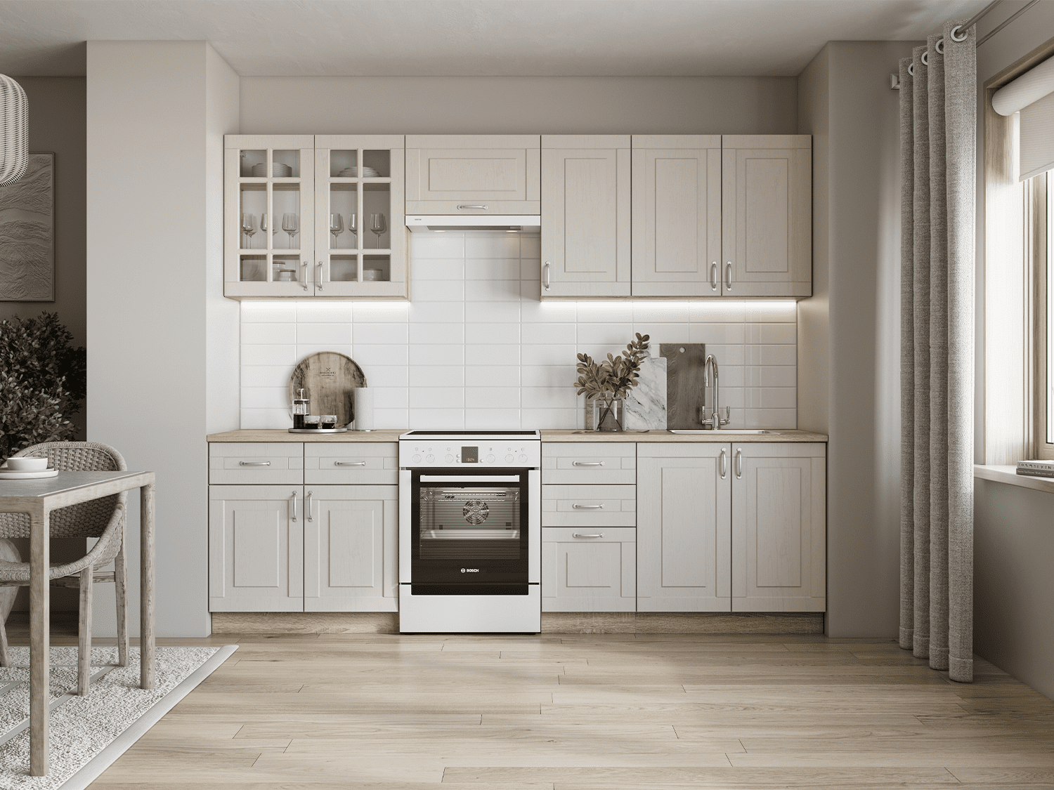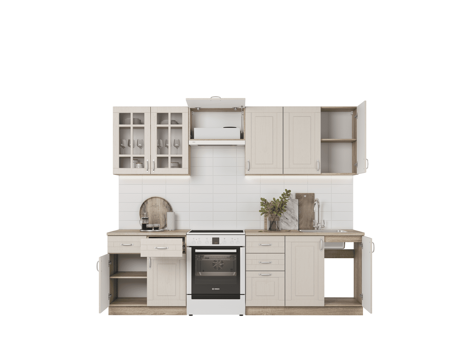 – Korpus od univera – Front od medijapana – Kaljeno staklo – U cenu kuhinje nisu uračunati bela tehnika, sudopera, slavina i dekoracija – Kupac moze sam da odredi raspored elemenata ŠIRINA: 260 cm VISINA: 195 cm DUBINA: 60 cm - Dodatne informacije