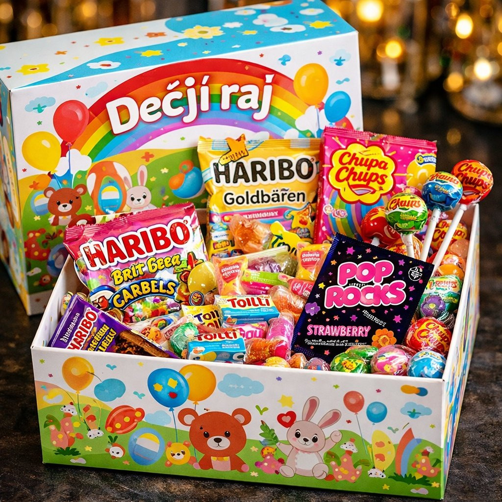 Opis proizvoda: Dečji raj je kutija koja će oduševiti svako dete. Šarena kutija sa veselim motivima skriva Haribo medvede, Chupa Chups lizalice, Pop Rocks i još mnogo omiljenih dečjih poslastica. Sve sadržano je bez alkohola i provereno bezbedno za decu. Sadrži 5 različitih proizvoda. Savršen poklon za dečje rođendane, Novu godinu i Uskrs. - Additional Information