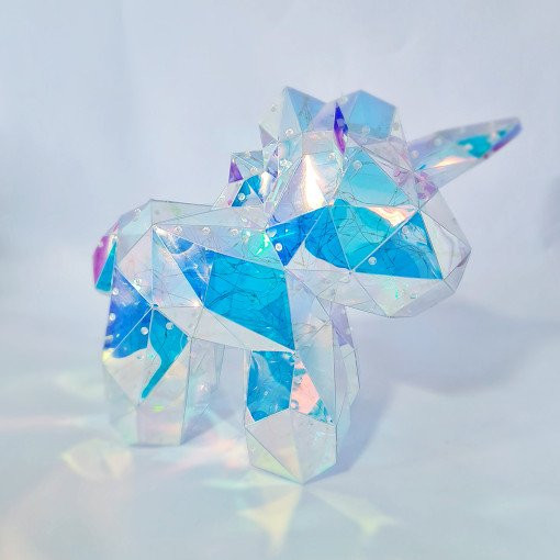 Ovaj jednorog je pravo malo remek delo nastalo metodom papercraft tehnike, svaki detalj je pažljivo oblikovan i izrađen kako bi stvorio realističan izgled ovog mitskog stvorenja. Napravljen je od specijalog pvc materijala sa efektom holograma koji je presijava.
