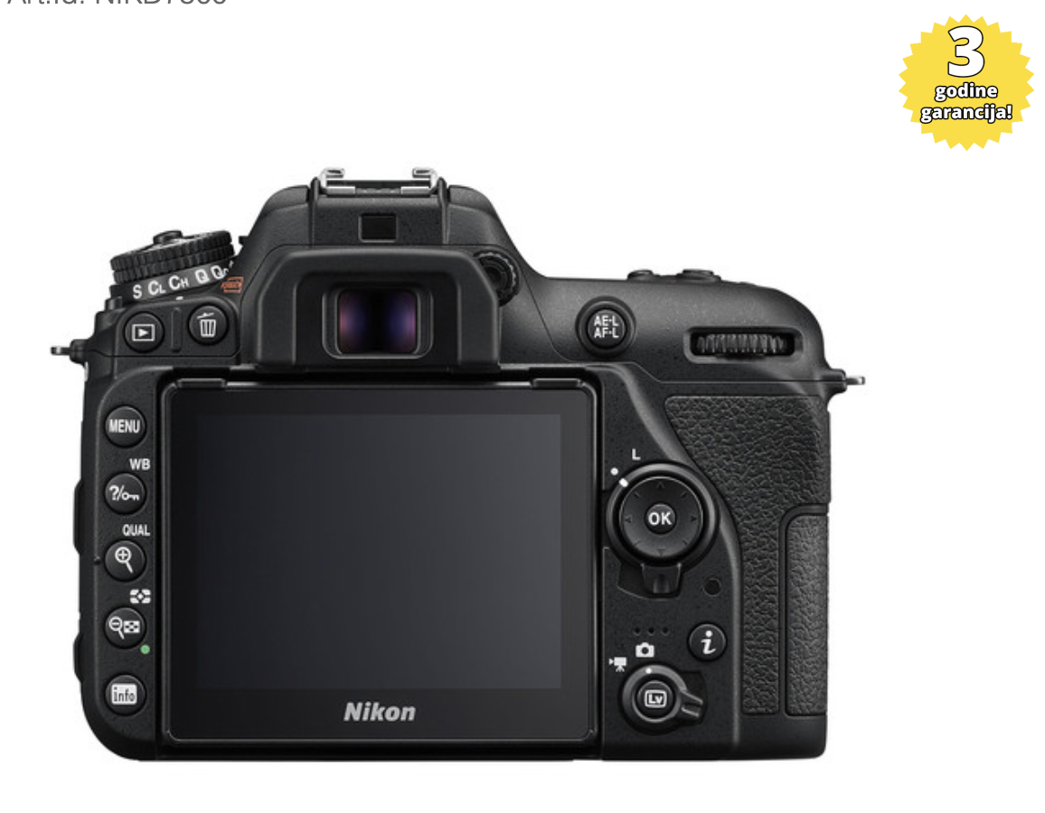Dizajniran kao all-round model, Nikon D7500 je DSLR fotoaparat DX formata koji nudi svestrani set funkcija tako da odgovara naprednim fotografima i videografima. Zasnovan na CMOS senzoru od 20.9MP i procesoru slike EXPEED 5 ovaj aparat omogućava brzinu snimanja od 8fps za do 100 uzastopnih JPEG-a, osnovni opseg osetljivosti ISO do 51200 koji se može proširiti na ISO 164000 i 4K UHD video mogućnosti snimanja sa time-lapse opcijom. Autofokusni sistem sa 51 tačkom Multi-CAM 3500FX II sadrži 15 tačaka krstastog tipa za brze performanse i precizne praćenja predmeta u različitim svetlosnim uslovima. D7500 karakteriše elegantan profil i konstrukcija koja je udobna i laka za rukovanje. Optoran je na razlilite vremenske uticaje što olakšava upotrebu u teškim uslovima. Pored optičkog tražila opremljen je i zadnjim 3.2" ekranom osetljiv na dodir tačnom 922000 tačaka koji ima podešavanje nagiba da bi olakšap rad iz visokih i niskih uglova snimanja. Pored toga, SnapBridge Bluetooth i Wi-Fi omogućavaju bežični prenos fotografija i klipovA kao i daljinsko upravljanje aparatom sa povezanih mobilnih uređaja. 20.9MP DX-Format Senzor i EXPEED 5 Procesor CMOS senzor DX formata i rezolucije 20.9MP uparen je sa procesorom slike EXPEED 5 kako bi pružio mešavinu visoke osetljivosti, nijansiranog kvaliteta slike i velike brzine rada. Opseg osetljivosti od ISO 100-51200 omogućava rad u širokom spektru svetlosnih uslova i može se dalje proširiti na ISO 50-164000 (Lo 1 do Hi 5) da bi se nosili sa najizazovnijim situacijama. Mešavina rezolucije i veličine senzora takođe doprinosi kvalitetu slike i glatkim prelazima u boji uz smanjennivo šuma. Osim što poboljšava kvalitet slike, procesor EXPEED 5 omogućava veliku brzinu fotoaparata, uključujući vrhunsku kontinuiranu brzinu snimanja od 10 kadrova u sekundi uz stalno fokusiranje i merenje ekspozicije. Do 200 kadrova može biti snimljeno u jednom nizu, čak i kada snimate 14-bitne bez gubitaka kompresovane RAW fajlove. Video zapis Nikon D500 podržava 4K UHD snimanje video zapisa brzinom od 30, 25 i 24 fps i Full HD / HD snimanje do 60 fps, uz mogućnost snimanja klipova na memorijske kartice ili kao nekompresovane fajlove na opcioni eksterni snimač putem HDMI izlaza. Tri opcije zone senzora za snimanje video zapisa su omogućene: 4K UHD format video zapisa omogućava 1.5x povećanje efektivne žižne daljine objektiva koji se koristi i rezervisan je za snimanje 4K 3840 x 2160 klipova. 1.3x krop DX senzora koristi se za snimanje FULL HD i HD video zapisa. DX format slike koristi potpunu širinu senzora i koristi se za snimanje video zapisa Full HD 1920x1080 i HD 1280x720 rezolucija. Ovo podešavanje je pogodno za plitku dubinsku oštrinu i pruža najširi vidni ugao. 51-Point Multi-CAM 3500FX II Autofokus Sistem D7500 poseduje autokousni sistem sa 51 tačkom, sa mogućnostima korišćenja 9, 21 ili svih 51 tačaka u zavisnosti od situacije, sa osetljivošću AF-a do -3 EV. 15 tačaka krstastog tipa su takođe integrisane unutar ovog polja kako bi se obezbedila još veća preciznot izoštravanja. Pri korišćenju telefoto objektiva i telekonvertera, središnja tačka je osetljiva na vrednost otvora blende od f/8. 3D praćenje je deo inteligentnog sistema za prepoznavanje scena i poboljšava održavanje fokusa na pokretnim objektima. Pored toga, dostupni su i AF u jednoj tački, AF sa dinamičkim područjem (sa 9, 21 ili 51 tačkom), 3D praćenje (koristeći svih 51 tačku) i AF sa automatskim područjem, kao i AF u grupnoj zoni koja tretira manje grupe AF tačaka kao jedinstvenu tačku za šire polje prepoznavanja i dobro je prilagođen za praćenje lica ili drugih predmeta. Kada radite u liew-view modu, bilo fotografisanje ili snimanje klipova, koristi se AF sistem zasnovan na kontrastu kako bi se precizno postigao fokus a može funkcionisati u neprekidnom, servo režimu kako bi bolje fokusirao pri radu sa pokretnim objektima. SnapBridge Bluetooth Konekcija D7500 sadrži ugrađenu SnapBridge mogućnost povezivanja koja omogućava prenos slika na mobilni uređaj. BLE (Bluetooth Low Energy) tehnologija i Wi-Fi omogućavaju komunikaciju između kamere i pametnog uređaja. Pored toga, mobilni uređaj može daljinski aktivirati okidač i prikazati sliku uživo kako bi se omogućio rad sa distance. Dizajn tela aparata Carbon-fiber šasija omogućava veliku otpornost tela aparata pri radu u teškim uslovima, a zaptivenost spojeva omogućava otpornost na vremenske uticaje. Ergonomija je posebno prilagođenu radu sa tele objektivima. Veliki LCD monitor osetljiv na dodir od 3,2" ima visoku rezoluciju sa 922000 i obezbeđuje snimanje uživo, navigaciju po meniju ili pregledanje snimaka. Svetlo optičko tražilo (pentaprizma) nudi 100% pokrivenost kadrova i 0.94x uvećanje Ugrađeni pop-up blic može se koristiti za dodatno osvetljenje tokom rada u uslovima slabog osvetljenja. Hot-shoe je takođe tu za montiranje eksternog blica. Mehanički zatvarač je testiran na 150000 okidanja Litijum-jonska baterija EN-EL15 pruža približno 950 snimaka po punjenju. Ostale mogućnosti fotoaparata: RAW (NEF) fajlovi se mogu snimiti kao kompresovani sa ili bez gubitaka bilo na 12 ili 14-bitnoj dubini. Active D-Lighting pomaže u očuvanju detalja u svetlim tonovima i senkana tokom rada u scenarijima bogatim kontrastom. Koristeći snagu procesora EXPEED 5 dobija se kontrolisana slika sa osvetljenjem bližim načinu na koji se prirodno vidi scena. Spot kontrola balansa belog omogućava jednostavno postavljanje istog tako što na displeju postavimo zonu u kojoj treba da bude belo. Režim višestruke ekspozicije omogućava vam da kombinujete do 10 različitih ekspozicija u jednu sliku, uz mogućnost da sačuvate svih 10 zasebnih snimaka ili samo kompozitne slike. Automatska kontrola osetljivosti ISO omogućava vam da odaberete minimalnu brzinu zatvarača a zatim će fotoaparat automatski podesiti ISO vrednost kako bi se najbolje eksponiranala scena. Takođe se 