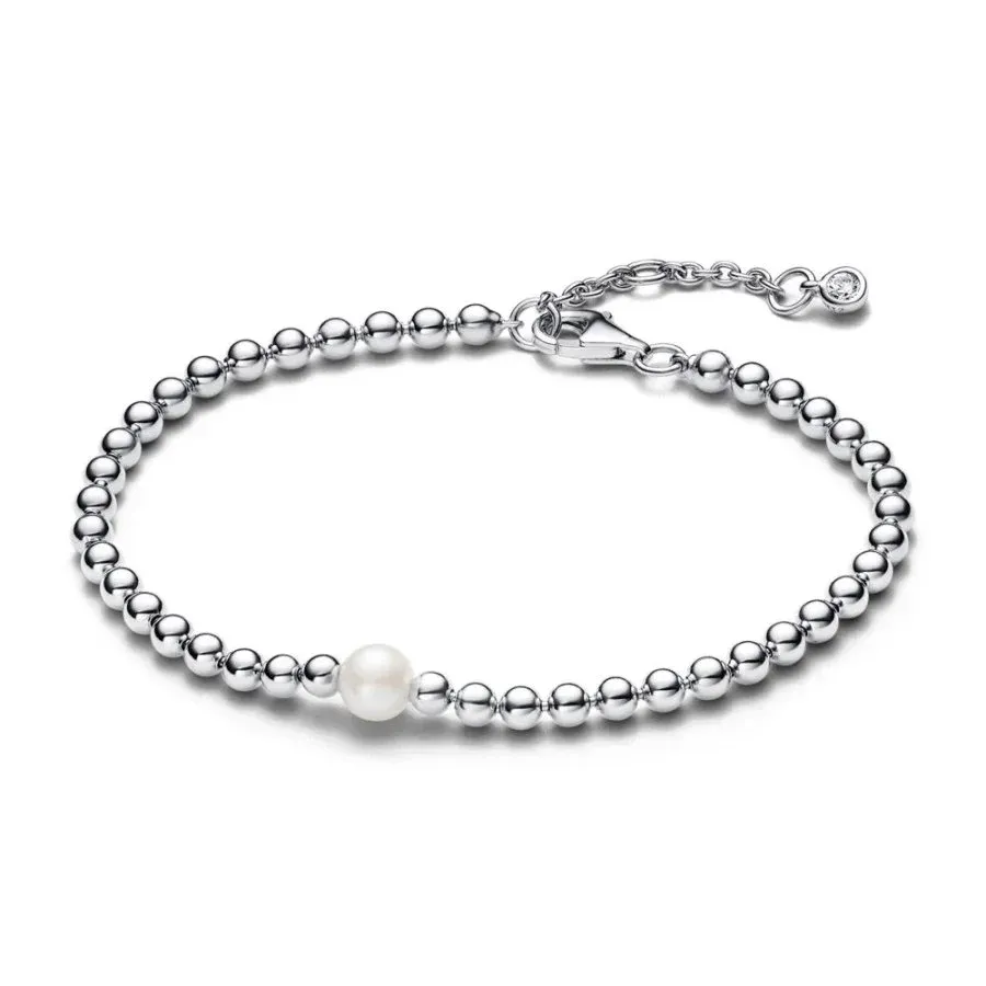 Prigrli sjaj uz našu narukvicu sa tretiranim slatkovodno gajenim biserom i perlama od čistog srebra. Centralni biser, okružen uglačanim metalnim perlama, čini suštinu Pandora Timeless. Nagoveštaj sjaja iz kupastog cirkona sija kod kopče, donoseći suptilni sjaj. Svestrani i simbolični, tretiranim slatkovodno gajeni biseri oličavaju lepotu, mudrost i ljubav. Napomena: svaki tretirani slatkovodni gajeni biser je jedinstven i može se razlikovati po veličini i boji; kod ovog materijala može doći do normalnog habanja. Naši slatkovodni gajeni biseri tretirani su izbeljivanjem i poboljšanjem sjaja.