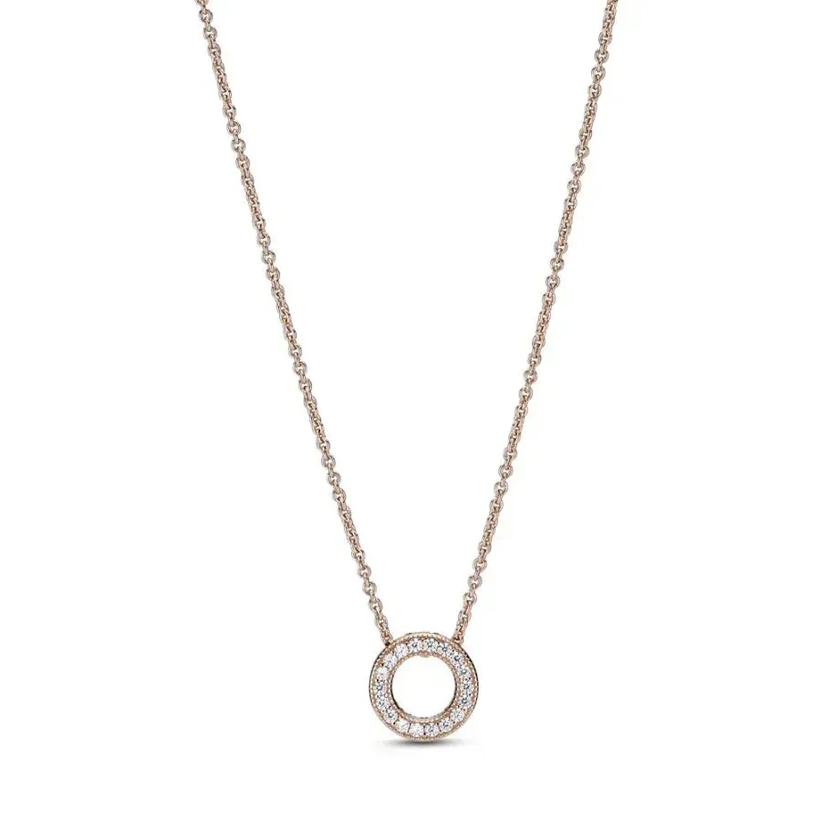 Ogrlica uz vrat Pavé krug sa Pandora logom posvećena je kolekciji Pandora Signature. Ručno završen od 14 roze pozlate ovaj dvostrani komad sa otvorenim centrom krasi mnoštvo detalja. Sa jedne strane kruga nalaze se prozirni kockasti cirkoni. Poleđina visokog sjaja ukrašena je ugraviranim Pandora logom. Pokažite svoju strast prema klasičnom dizajnu ovom podesivom ogrlicom sa Pandora logom i izrezanim srcima na stranicama kruga. - Dodatne informacije