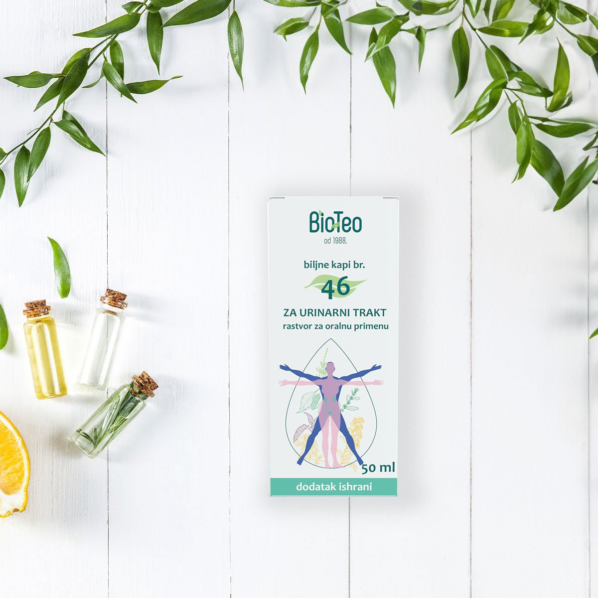 Bio-Teo biljne kapi br. 46 ZA URINARNI TRAKT su dodatak ishrani na bazi vodeno-etanolnih ekstrakata herbe rastavića, lista koprive, herbe ivanjskog cveća, herbe zlatnice, herbe troskota i lista breze namenjen zdravlju urinarnog trakta. Herba rastavića, herba koprive, herba zlatnice i herba troskota pomažu normalno funkcionisanje urinarnog trakta. List breze povoljno utiče na varenje i unapređuje procese detoksikacije organizma, podržava normalan nivo holesterola u krvi i olakšava izlučivanje vode iz organizma.