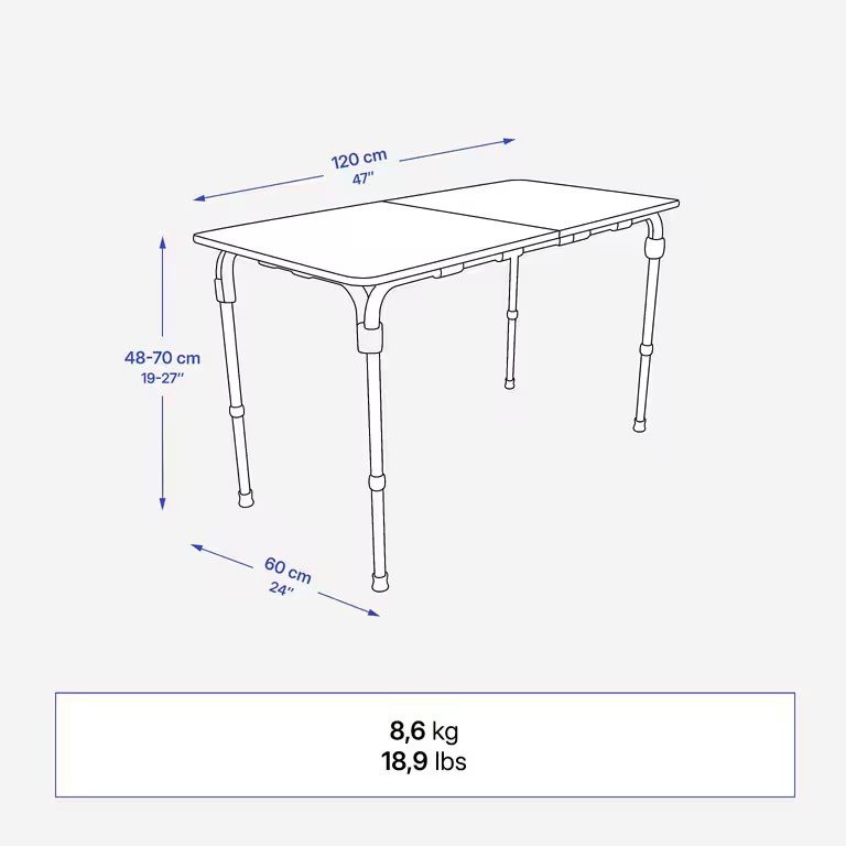 Sto idealan za kampovanje: nogare se lako podešavaju okretanjem za četvrtinu kruga, kompaktan kada se sklopi (62 x 62 x 11 cm). Pametna torba s ručkama omogućava lako nošenje i zaštitu.