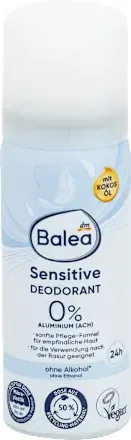 Balea SENSITIVE dezodorans u spreju u ovoj praktičnoj putnoj ambalaži u svom sastavu uključuje negujući kompleks sa kokosovim uljem i razvijen je posebno za osetljivu kožu tako da se može koristiti i nakon brijanja. Pouzdano i dugotrajno štiti od znoja i neprijatnih mirisa i do 24h. Nežnoj koži pazuha obezbeđuje potrebnu vlažnost. Balea SENSITIVE dezodorans u spreju je bez aluminijumovih soli (ACH) i bez alkohola (bez etanola).