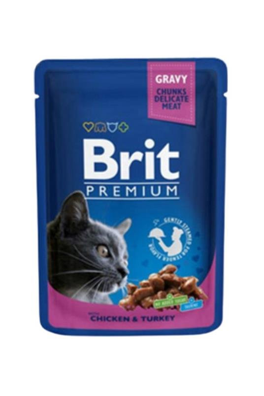 BRIT PREMIUM kesica, sočni komadići, piletina s ćuretinomPotpuna hrana za odrasle mačkeBez šećera, bogata taurinom.SASTOJCI: meso i mesne prerađevine u komadićima 80% (8% piletine, 8% ćuretine), prerađevine biljnog porekla (0,4% inulin), mineralne materije.Izrađeno po proizvođačkoj specifikaciji.ANALIZA: vlaga 82%, sirovi proteini 8,5%, sadržaj masti 4,5%, sirov pepeo 2,5%, sirova vlakna 0,4%.U 1kg hrane dodano je: vitamin D3 250 I.J., vitamin E (alfa tokoferol) 100 mg, cink 10 mg, mangan 2 mg, jod 0,7 mg, bakar (kao bakar sulfat pentahidrat) 0,2 mg, taurin 450 mg, biotin 0,1 mg.Bez veštačkih boja i konzervanasa.Nivo vitamina garantovan je do isteka roka upotrebe proizvoda.PREPORUKA ZA HRANJENJE: Osigurati dovoljnu količinu sveže vode za piće. Poslužiti na sobnoj temperature. Jednom otvorenu kesicu držite u frižideru.Dnevna količina zavisi od starosti, konstitucije i kondicije, kao i od godišnjeg doba.Proizvod čuvati zatvoren na suvom i hladnom mestu.PREPORUČENE DNEVNE KOLIČINE:Telesna masa odrasle mačke (kg) = kesica dnevno:2 kg = 1,5 kesica4 kg = 3 kesica6 kg = 4 keseca8 kg = 5 kesica