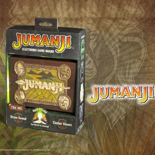 Avanturisti budite upozoreni! Ne započinjite ovu igricu ukoliko ne nameravate da je završite. Jumanji je igrica za one koji traže način da ostave svoj život iza sebe. Čuvajte se džugle i nemilosrdnog lovca koji neće prestati da vas lovi. Čim čujete bubnjeve, bežite!Igra sadrži plastičnu kutiju koja se otvara i otkriva tablu za igranje, u 2 pregrade su skrivene 2 kockice i 4 totema, instrukcije za igru su na engleskom jeziku. U sredini table se nalazi Jumanji logo koji svetli zelenom bojom i svaki put kada zasvetli se čuju zvuci bubnjeva. Neka igra počne.