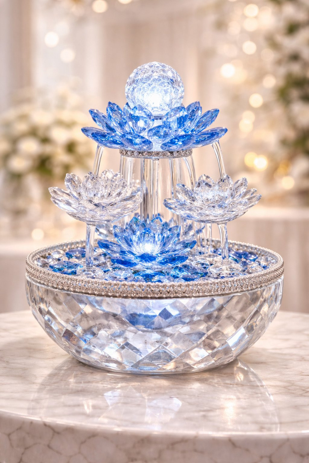 Elegantna mala stolna kristalna fontana izrađena od ručno rađenog stakla, u prelijepoj plavoj boji. Njena luksuzna izrada i sofisticirani dizajn čine je savršenim dekorativnim elementom za svaki prostor – bilo na stolu, polici ili u dnevnom boravku. - Dodatne informacije