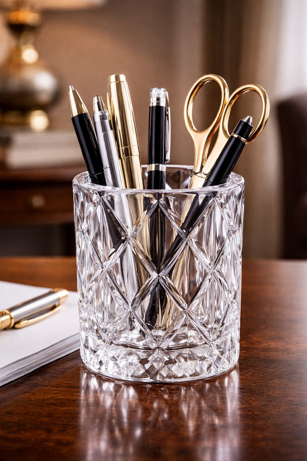 Kristalni držač za olovke izrađen je od ručno rađenog stakla vrhunskog kvaliteta, u elegantnoj beloj, odnosno prozirno-beloj nijansi koja ističe čistoću i sjaj kristala. Klasičan stil oblikovanja, sa bogato brušenim detaljima i pravilnim geometrijskim uzorcima, daje ovom predmetu bezvremenski i sofisticiran izgled. - Dodatne informacije