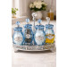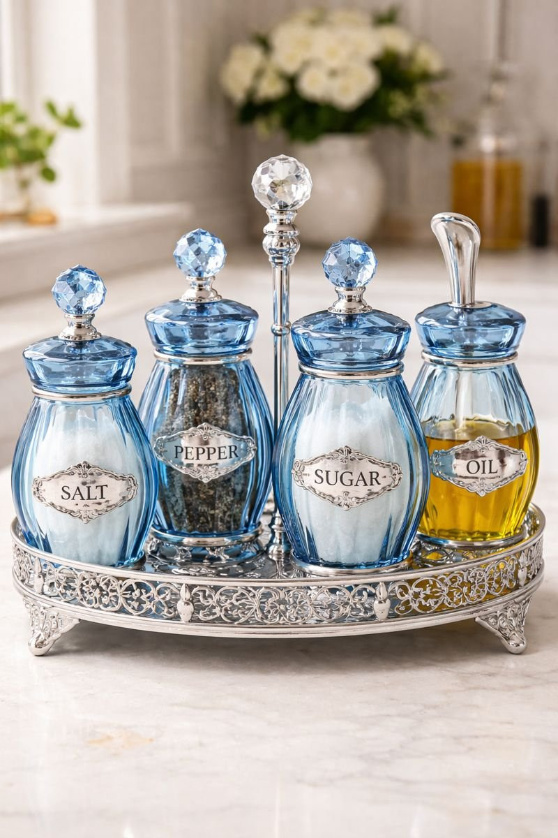 Klasičan stakleni set za začine izrađen od kvalitetnog, prozirnog stakla sa elegantnim plavim detaljima. Set je dizajniran u klasičnom stilu koji se lako uklapa u svaku kuhinju, bilo modernu ili tradicionalnu. Staklene posudice omogućavaju jasan pregled sadržaja, dok plava boja daje sofisticiran i uredan izgled. Pogodan za čuvanje različitih začina, soli, bibera i sušenog bilja. Lako se održava i otporan je na mirise, što ga čini praktičnim za svakodnevnu upotrebu. - Dodatne informacije