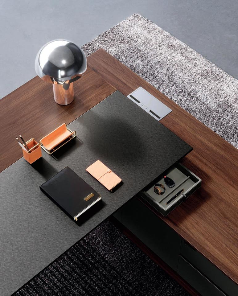 • Koncizne i uredne linije upotpunjene teksturom Feliks lešnika, mat kožnom i aluminijumskim umetcima po ivicama doprinose snažanom i čvrstom obliku