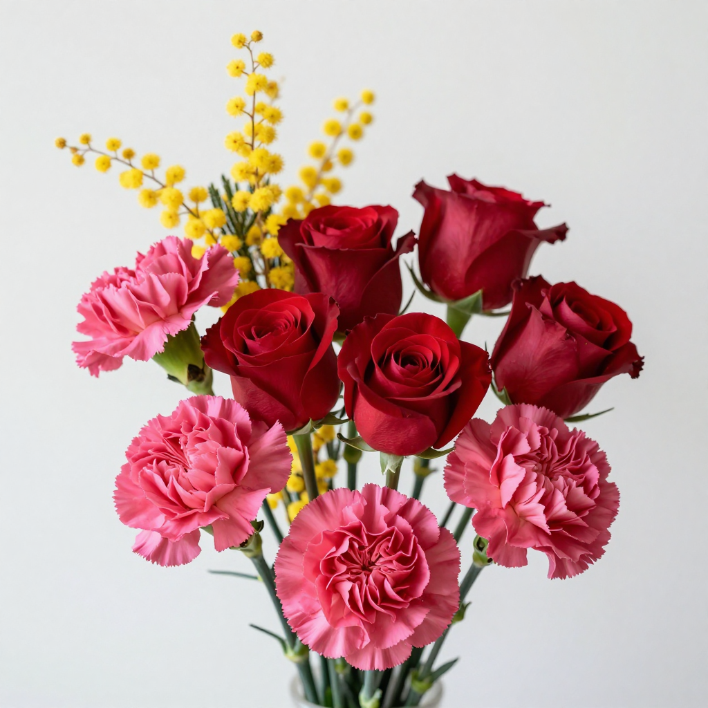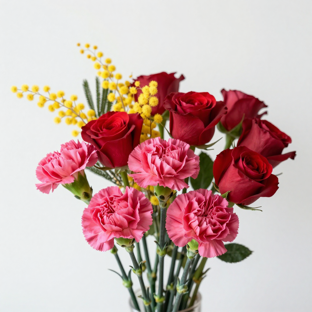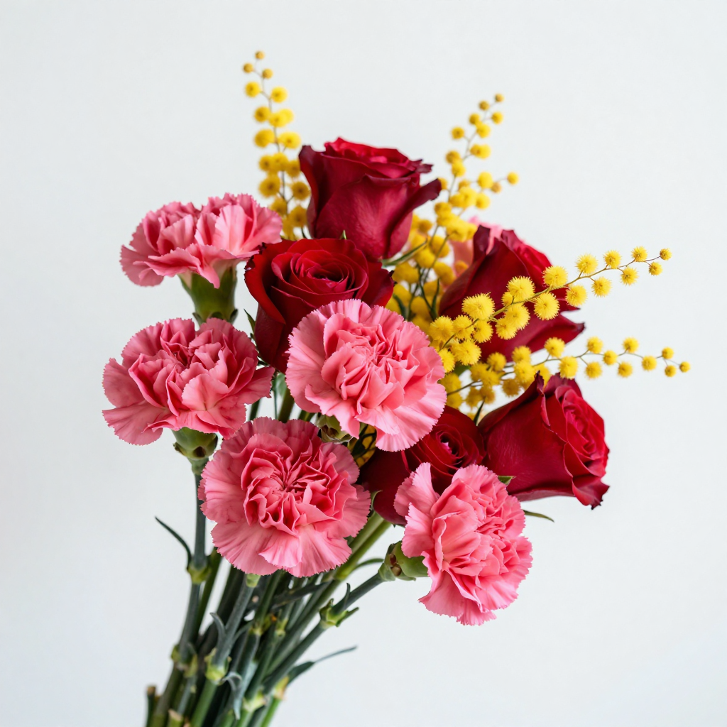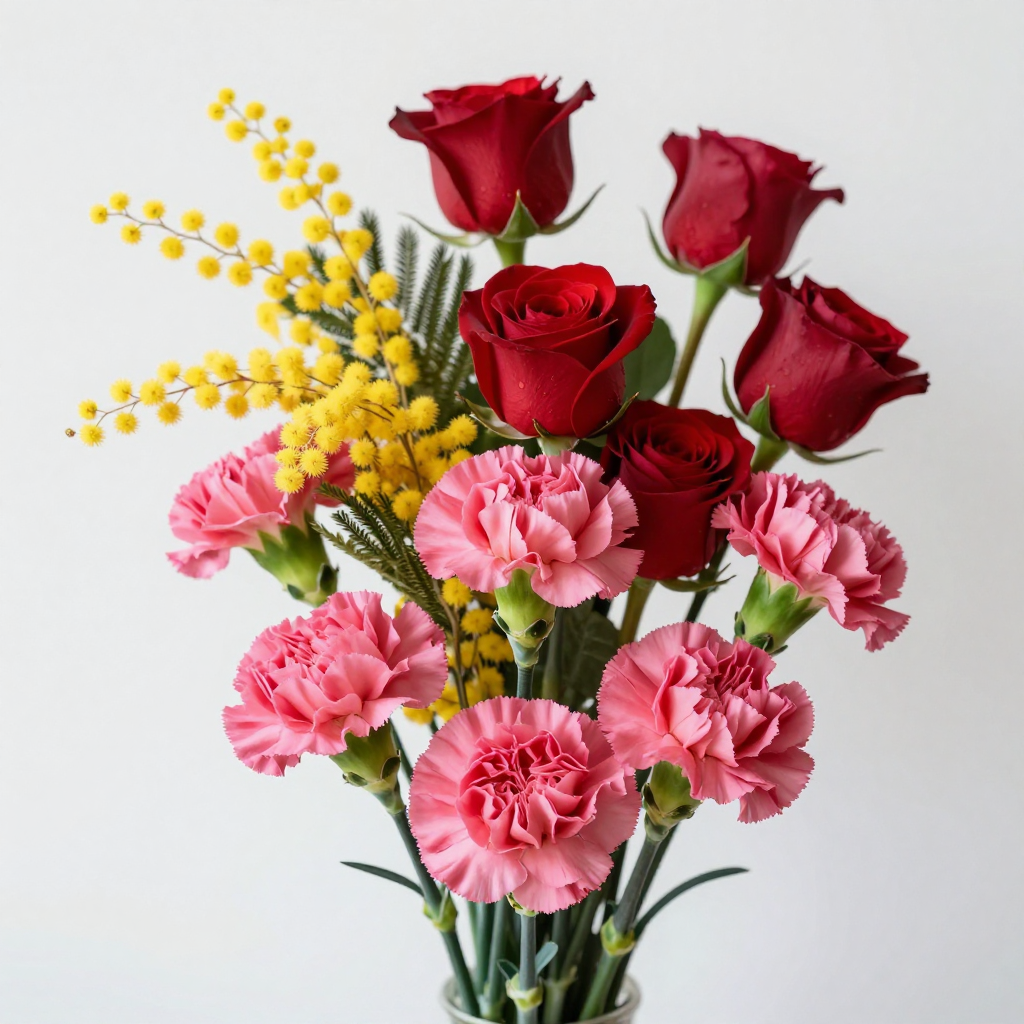 A vibrant bouquet of pink carnations, red roses, and golden mimosa branches created to celebrate Women’s Day with warmth, admiration, and color.