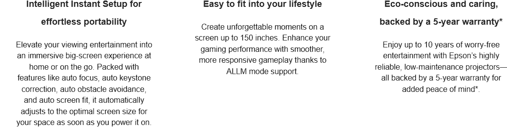 Enjoy truly immersive moments with Epson Lifestudio portable smart projectors. Sleek, compact, and loaded with features, they are designed with advanced, state-of-the-art image and audio technology, built-in smart TV functions, and effortless setup for seamless immersive entertainment indoors and out.