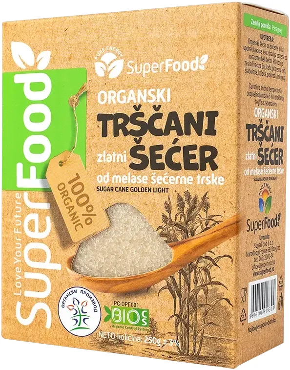 Trščani šećer je organska, zdravija zamena za beli šećer. Veoma je prijatnog ukusa koji donekle podseća na karamelu. Ovaj organski šećer se dobija presovanjem stabljika organski gajene šećerne trske, pri čemu se dobijeni sok zgušnjava i kristališe i koncentriše u sirup. Potom mu se dodaju kristali šećera kako bi se podstakla kristalizacija i odvaja se deo melase (ali ne sva). Zašto je zlatni šećer od šećerne trske zdrava opcija? Spada u jednokratno kristalizovane šećere, za razliku od belog šećera, koji se kristalizuje dvaput. Kristali organskog šećera su zlataste boje, obično nešto veći od kristala belog šećera i imaju blagu, cvetnu ili voćnu aromu i ukus. Pored saharoze sadrži i nezanemarljivu količinu minerala. Superfood zlatni šećer od šećerne trske dobija se isključivo od organski gajene šećerne trske, što znači da ne sadrži nikakve sintetičke herbicide ili pesticide. Kako ga konzumirati? Organski šećer od šećerne trske može biti savršen dodatak vašoj omiljenoj jutarnjoj rutini. Jednostavno ga dodajte u kafu, čaj ili kakao za karamelasti užitak. Pored toga, idealno se meša i sa sastojcima različitih, ne samo poslastica, već i slanih jela i dodaje im jedinstvenu slatkoću. Ideja za slatki doručak: pomešajte 3 kašike čia semenki sa 200 ml bademovog mleka i kašičicom šećera od šećerne trske, ostavite u frižideru preko noći i poslužite s voćem po izboru. Ideja za brzu i zdravu grickalicu: otopite kašiku šećera od šećerne trske u tiganju, dodajte šaku badema, mešajte dok se ne oblože karamelom, pospite prstohvatom morske soli i ostavite da se ohlade. *Važna napomena: Savetujemo da se svakako pre upotrebe konsultujete sa svojim lekarom naročito ukoliko imate povišen šećer u krvi ili slične zdravstvene tegobe.