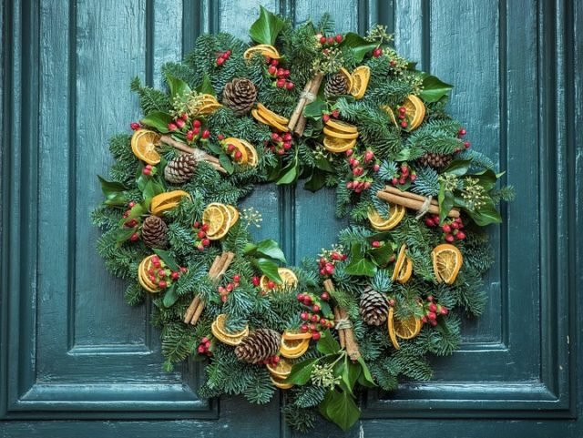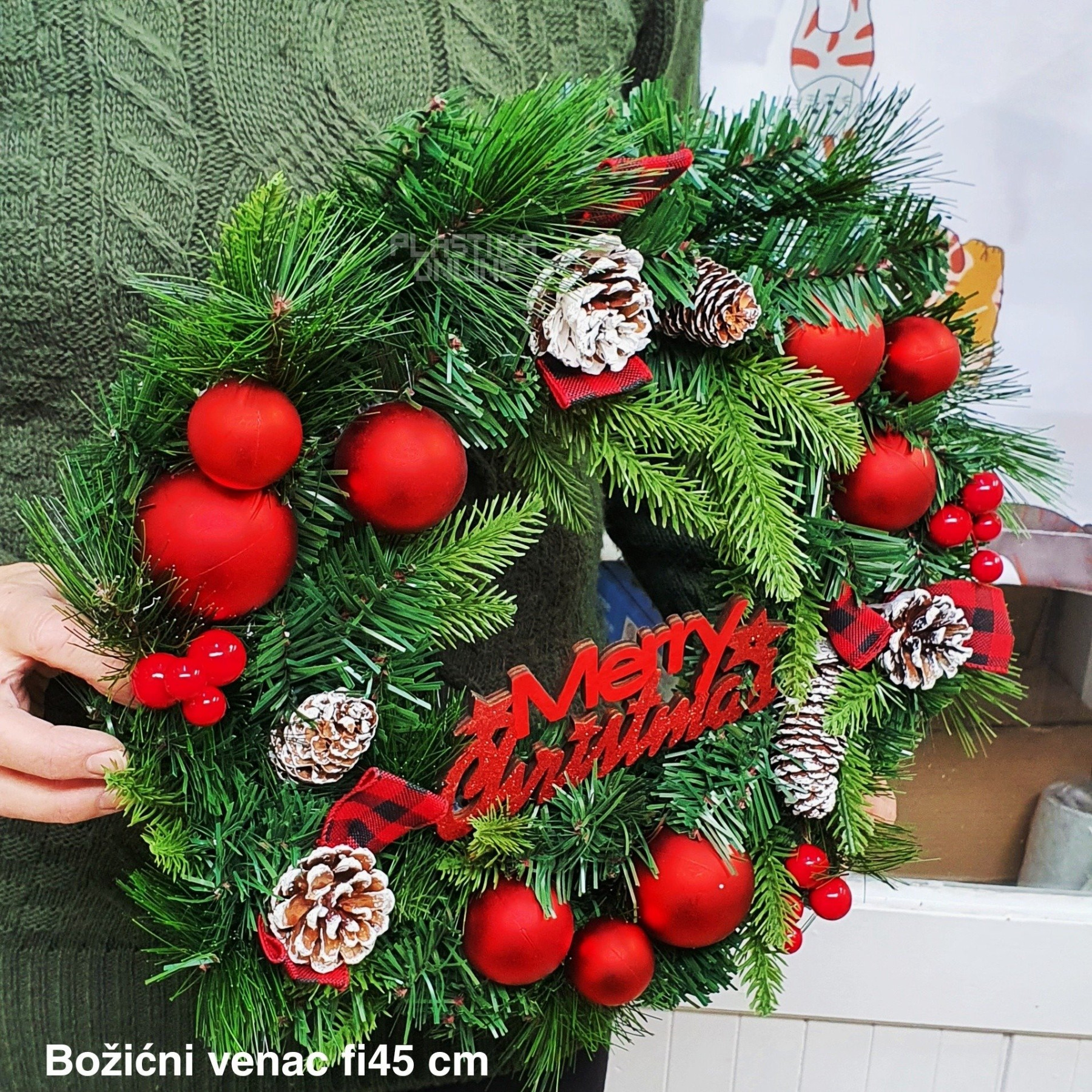 Klasičan vijenac sa zelenim granama i crvenim bobicama.