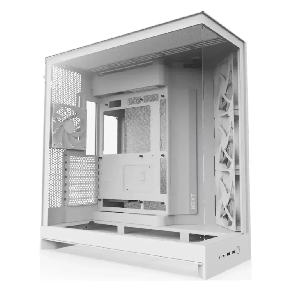 NZXT H9 Flow White je mid-tower kućište dizajnirano za gejmere i entuzijaste koji traže kombinaciju performansi, estetike i hlađenja. Sa perforiranom prednjom pločom i unaprijed instaliranim ventilatorima, omogućava optimalan protok vazduha, dok prostrani unutrašnji prostor podržava ATX, Micro-ATX i Mini-ITX ploče, moderne grafičke kartice i vodeno hlađenje. Bijela boja i minimalistički dizajn daju sofisticiran izgled, a tempered glass bočna ploča omogućava pregled unutrašnjih komponenti i RGB osvjetljenja.