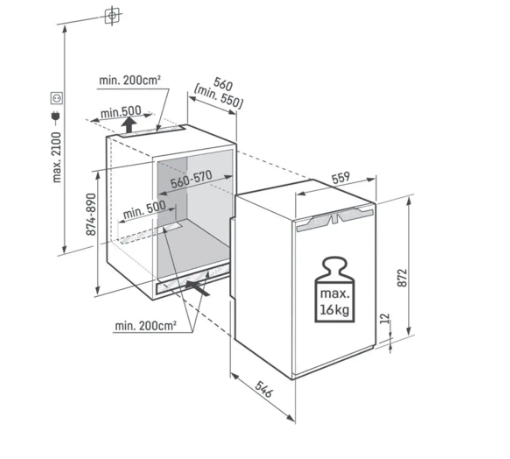 Dimenzije zamrzivača su 55.9 x 87.2 x 54.6 cm, dok ugradne dimenzije iznose 56-57 x 87.4 x 89 x 55 cm. Masa uređaja je 34.5 kg, a težina pakovanja 36.4 kg, sa dimenzijama pakovanja 57.2 x 93.1 x 62.2 cm.